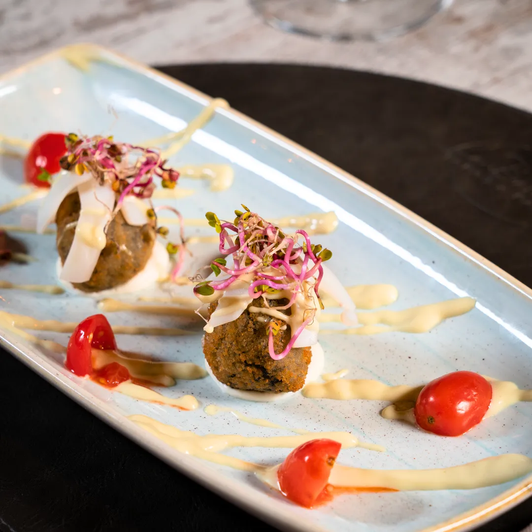 Crocchette al nero di seppia, con tagliatella di seppia e salsa di lime e avocado