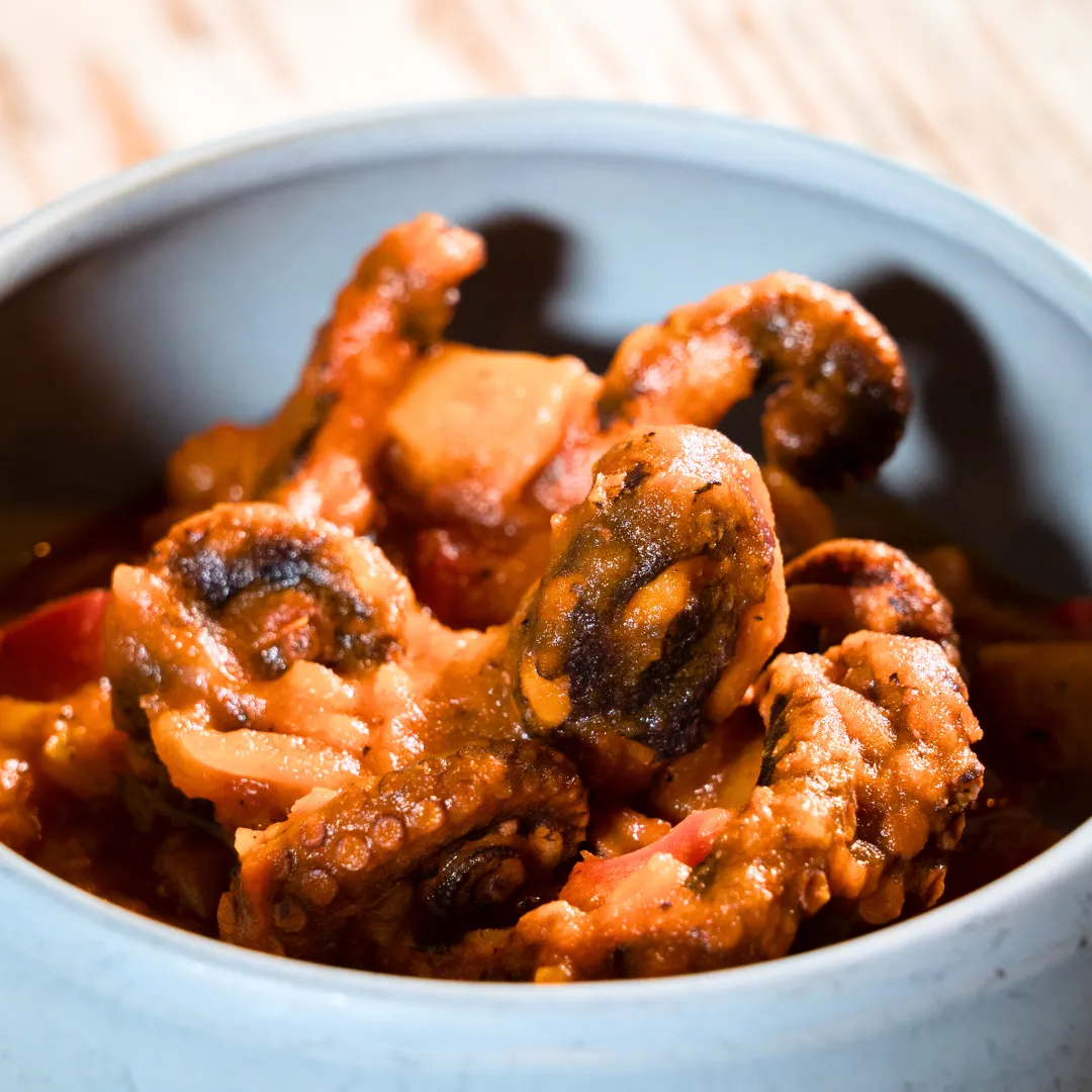 Polpo cotto in terracotta con patate, peperoni, pimento e salsa al pomodoro